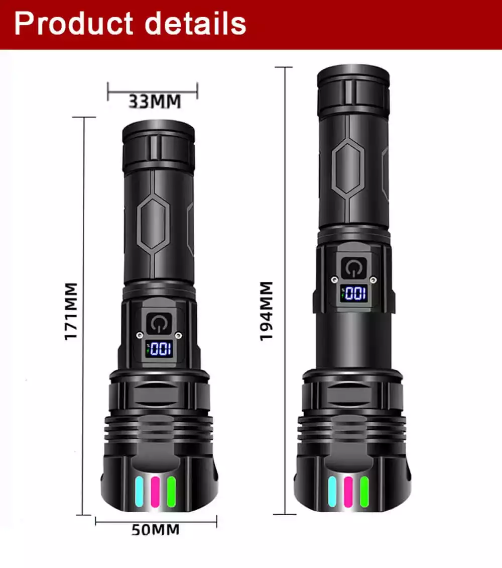 Are you still worried about not finding the flashlight you want? Take a quick look, this aluminum alloy flashlight adopts the latest LED chip, which not only completes a new upgrade in brightness (90000 lumens), but also illuminates a distance far beyond ordinary flashlights (up to 3000 meters). The design of the shark head at the lamp head is more effective in heat dissipation and avoids high temperature burns. And equipped with a luminous strip, you can always find your flashlight at night. Suitable for various outdoor activities, fishing, camping, mountaineering, exploration, etc...