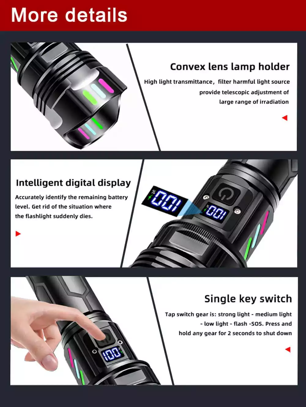 USB C RECHARGEABLE & LONG-LIFE & LCD POWER INDICATOR】This high power flashlight can provide 8-12 hours of powerful, non-diminishing brightness. Built-in a USB C charging interface, suitable for power bank, socket, laptop or any other USB devices, convenient for indoor and outdoor charging. The LCD display shows the exact battery level (0-100%). You will know how long it will last and charge it in time.
