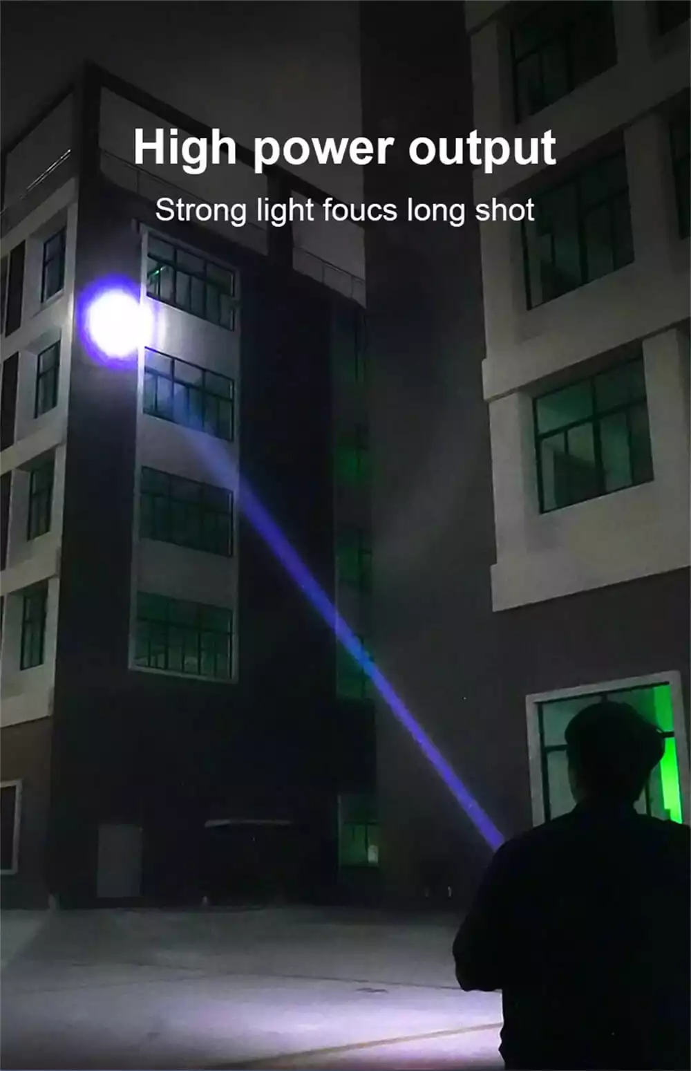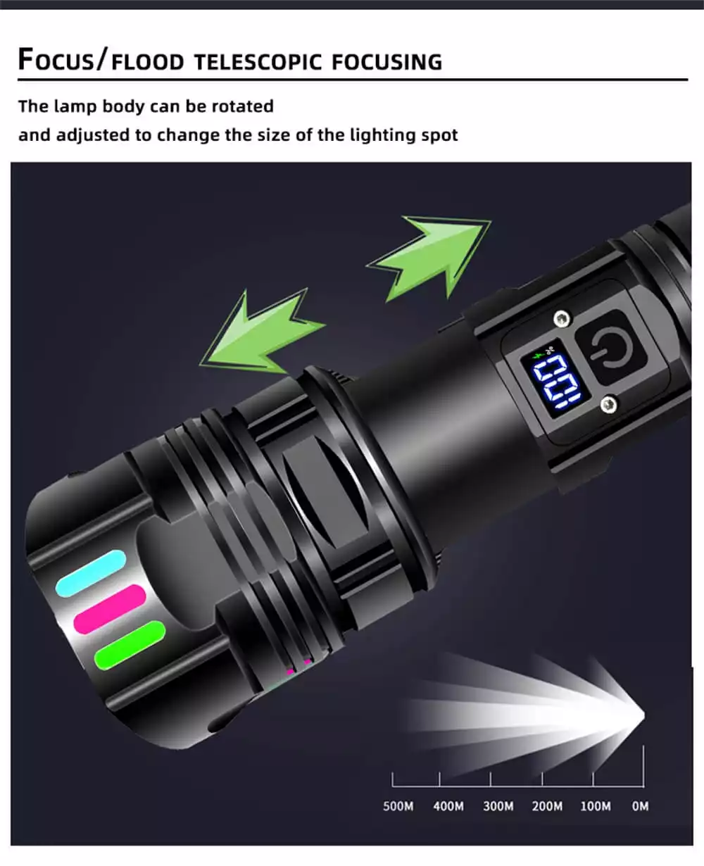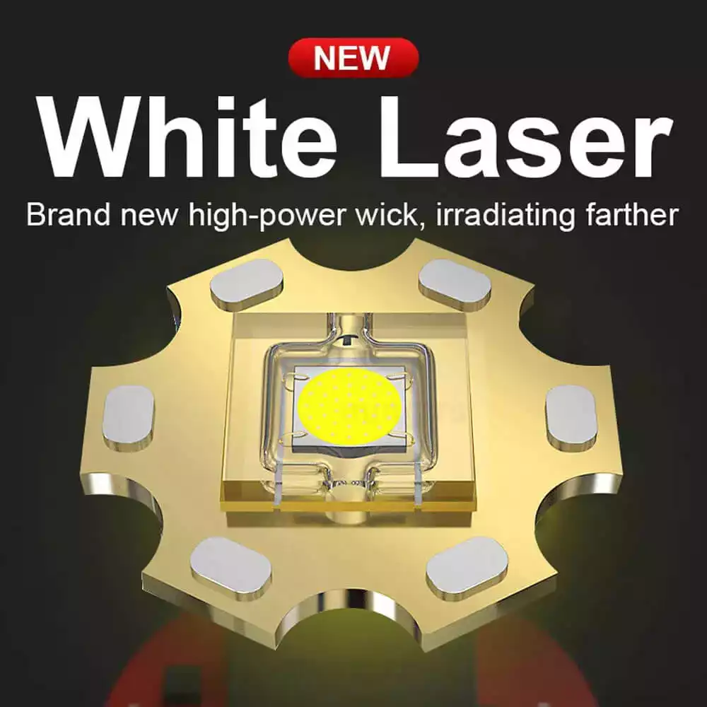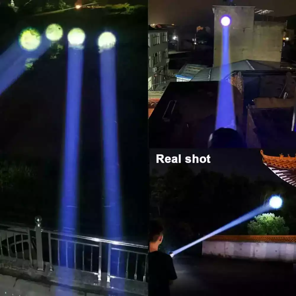 【SUPER BRIGHT HIGH BRIGHTNESS 90000 LUMENS】The high lumens flashlight is made of upgraded super bright white laser LED chip, the brightness can be up to 90000 lumens. It will can light an object up to 3000 meters away, there is no any problem to light a 500 square meters room. This high powered flashlight is perfect for hiking, camping, fishing, dark walk, emergencies or other outdoor activities, a compact handheld flashlight for home backup .