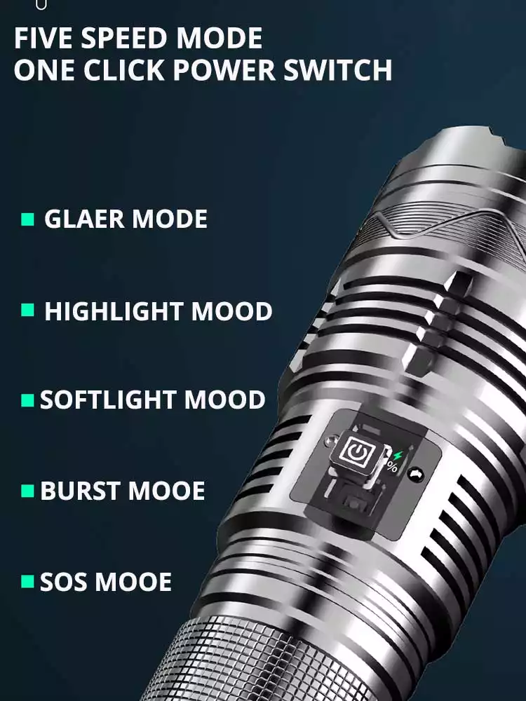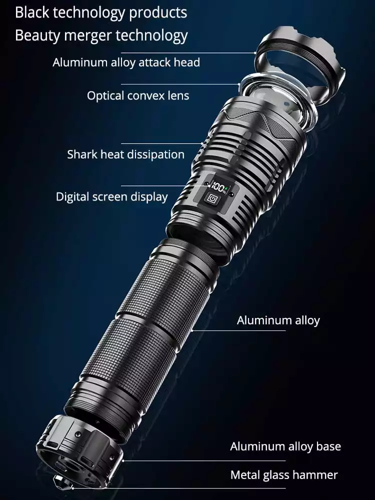 This Heavy Duty flashlight made of aerospace grade aluminum alloy, Non-slip and Durable, IPX6 waterproof for convenient usage in various extreme weather. This rechargeable flashlight have power display light help you see the rest power at a glance. remind you charge the flashlight in time, practical as camping flashlight or EDC Flashlight.