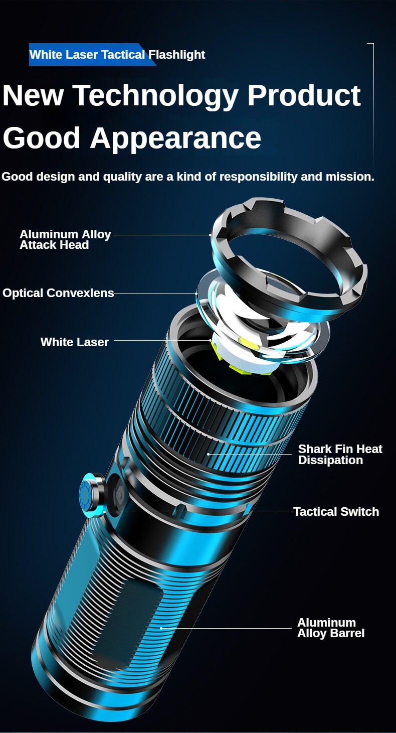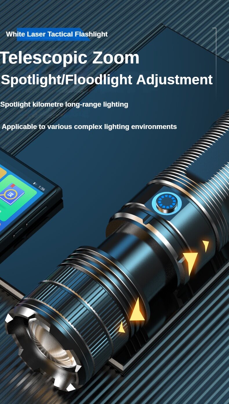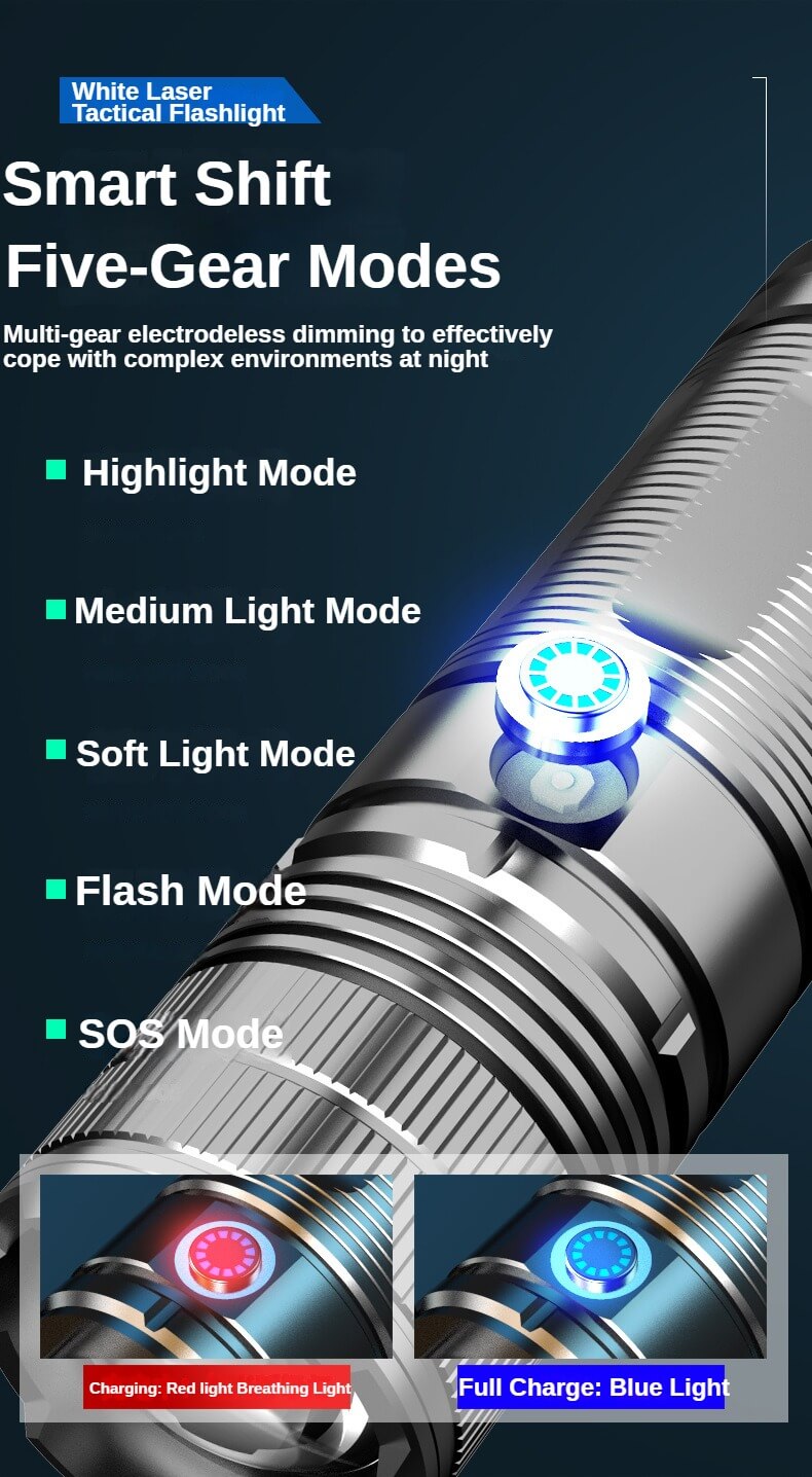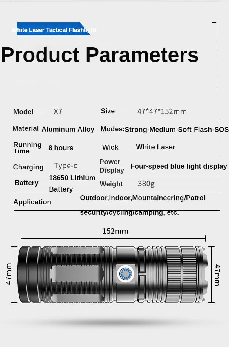 Product Description: The Powerful Laser Zoom Flashlight (SG-X7) is the perfect tool for any outdoor or indoor activity. Made with high-quality aluminum alloy, it is durable and lightweight (380g). With its 5 different modes (High-Medium-Soft-Strobe-SOS) and 1600LMS output, you can use it for camping, hiking, or any other adventure you have in mind. It is waterproof (IPX6) and can run for 8-12 hours, making it an ideal choice for long trips.
