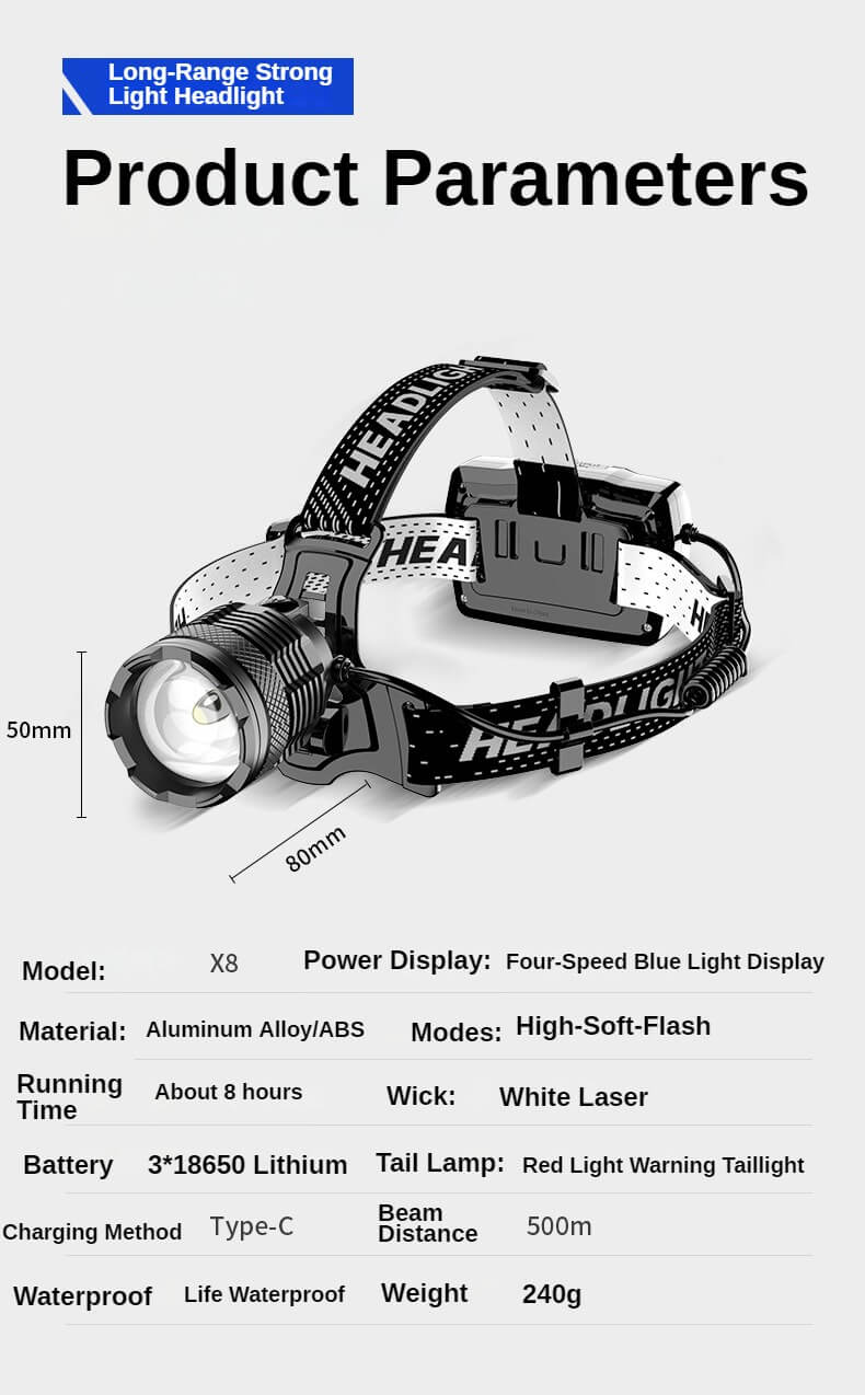Product Description: The Powerful Laser Zoom Headlamp (SG-X8) is the perfect tool for any outdoor or indoor activity. Made with high-quality aluminum alloy and ABS, it is durable and lightweight (240g). With its 3 different modes (High-Soft-Flash) and 1000LMS output, you can use it for camping, hiking, or any other adventure you have in mind. It is waterproof (IPX6) and can run for 8-10 hours, making it an ideal choice for long trips.