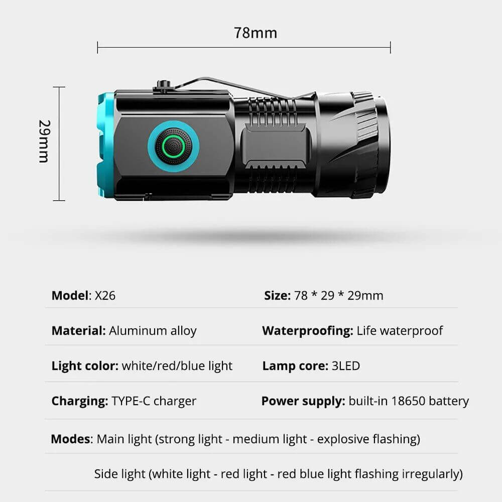 - Before charging, please make sure that the ΒATTERY is installed in the correct direction, otherwise the flashlight will be damaged.