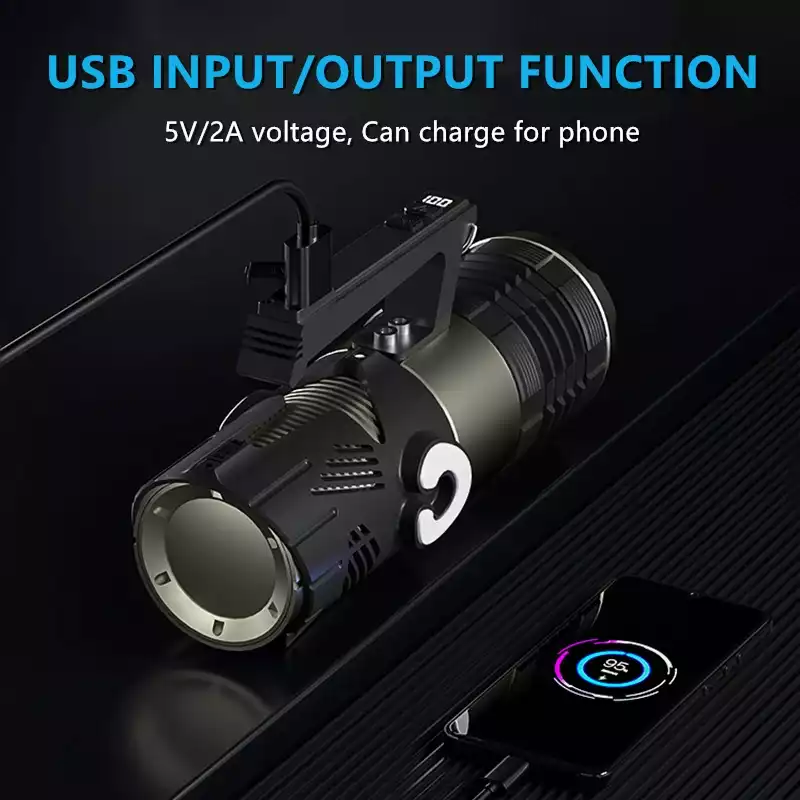 Rechargeable Flashlight High Lumens, 20800m-a-h large capacity Ba-tt-ery for a long life, this LED rechargeable flashlight could run up to 12-30 hours. USB input port allow you quickly charge the flash light and the USB output port help this led flashlight work as a emergency power bank to charge your phone, camera and etc.