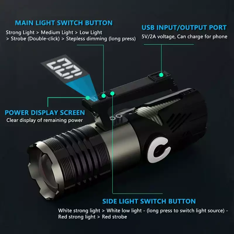 • 【LED TORCH RECHARGEABLE & LCD DIGITAL DISPLAY】With a built-in 20800mAh high-capacity rechargeable battery, the rechargeable torch can provide up to 48 hours of continuous low light when fully charged. It can be charged from any USB device such as laptop, wall socket. Also the super bright torch can output power to your phone for power outages or emergencies! With an LCD screen that visually displays the remaining battery life, you never have to worry about a low battery.